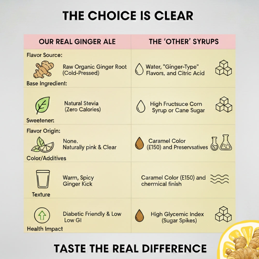 Our Gingerale syrup is made with real Ginger and Lemon Juice and sweetened with stevia and erythritol. No artificial colour, flavour or sweeteners have been used to enhance the taste of this product. NO PRESERVATIVES
