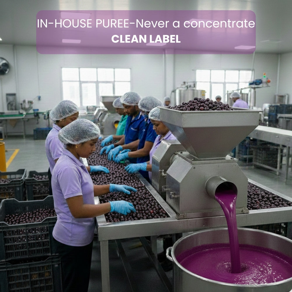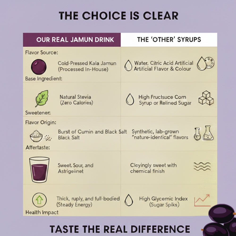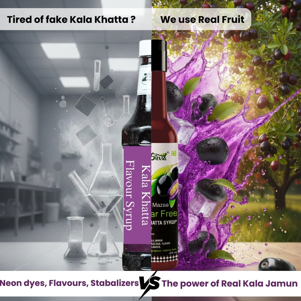 Our Kala Khatta syrup is made with real kala jamun, and sweetened with stevia and erythritol. No artificial colour, flavour or sweeteners have been used to enhance the taste of this product. We have used cumin and black salt to enhance the taste of kala jamun. NO PRESERVATIVES
