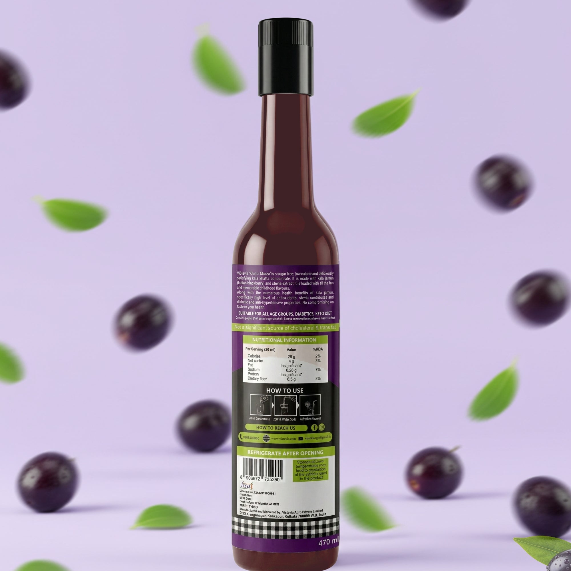 VISTEVIA Khatta Mazaa - Sugarfree Kala Khatta Syrup 470ml (makes 30-35 glasses) | 100% Natural - Made with Kala Jamun | Perfect for Diabetics | Tastes Delicious