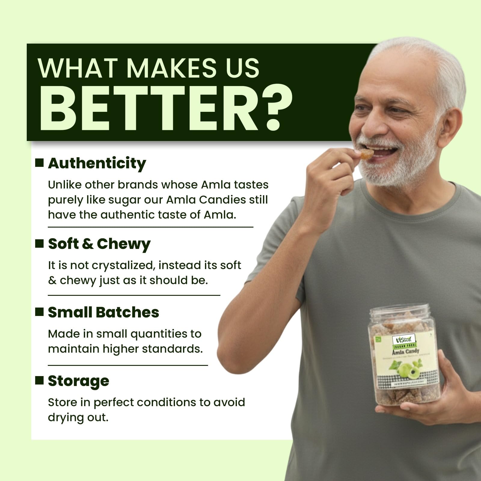 At Vistevia you get the pure goodness of Amla. Made without sugar, our candies are soft and chewy and sweetened with stevia. Unlike other amla candies in the market which have more sugar than amla itself, our candies have 100% amla and ZERO SUGAR.
