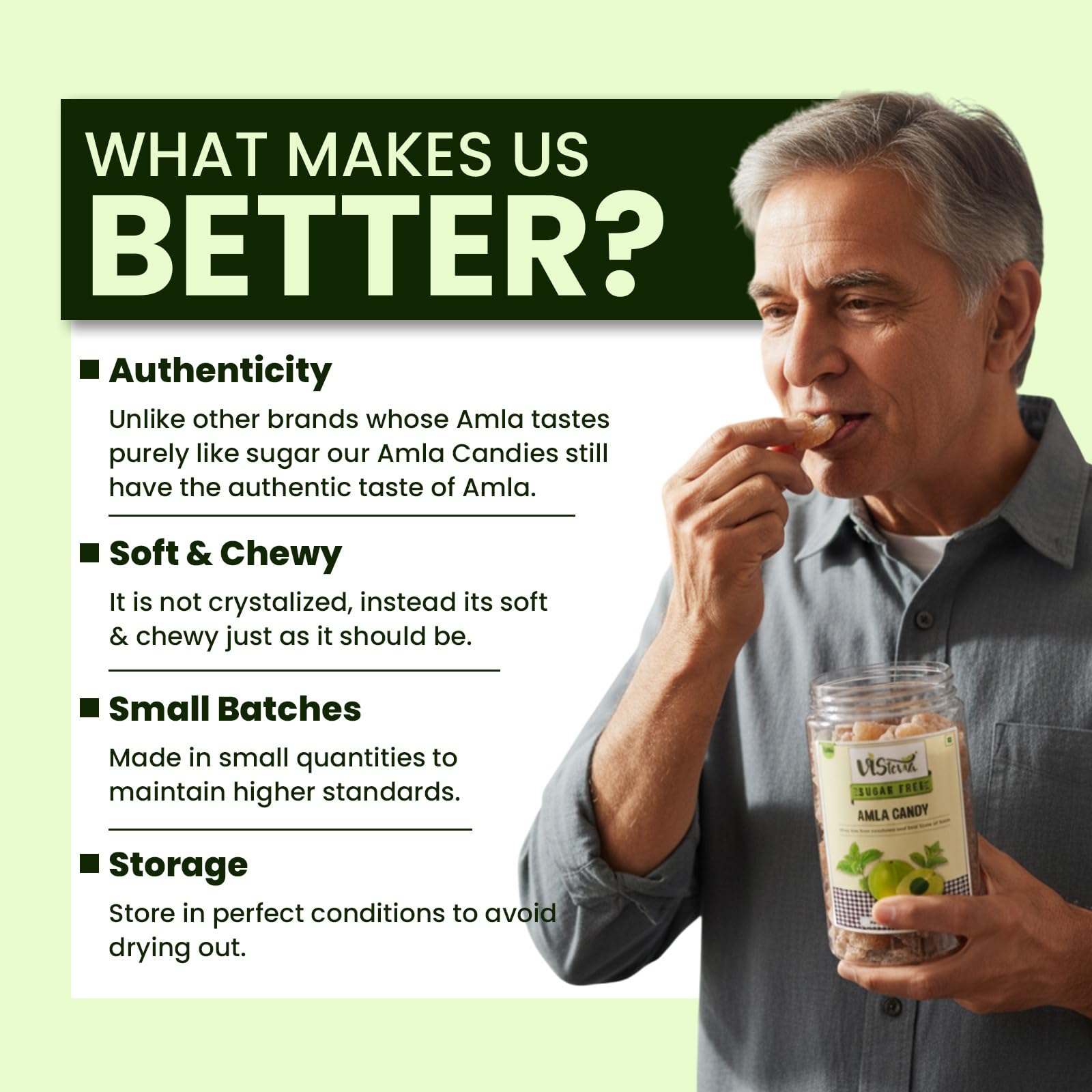 Experience the incredible power of Amla (Indian Gooseberry) with a delicious Chatpata (tangy and spicy) twist! VIStevia's Sugar-Free Amla Candy is an Ayurvedic Superfood that delivers Real Amla Goodness without any added sugar.